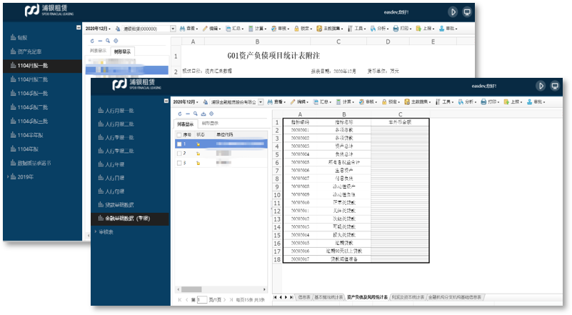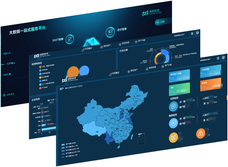 浦銀租賃大數據服務平臺一共建設了183張報表,涵蓋日常工作報表、財務報表、監管報送、1104報表、人行報表、總行報表、EAST報表等,滿足公司領導、資產部門、財務部等各部門人員多樣化的數據分析需求。幫助高管快速掌握公司的運營情況,精細化管理;讓業務人員自助拖拽報表,釋放實施人員精力,為業務人員提供工作便利,提高工作效率;支持監管報表的填報、審核、上報、匯總等工作,滿足監管報表的定時報送要求。