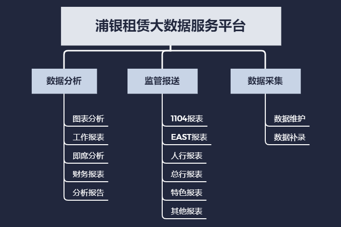基于監管報表生成質量無法得到有效保證、內外部數據的統計分析工作成為日常辦公基本需要、各部門對數據服務提出較高要求等問題,浦銀租賃大數據服務平臺總體設計分為數據分析、監管報送和數據采集三大模塊。
