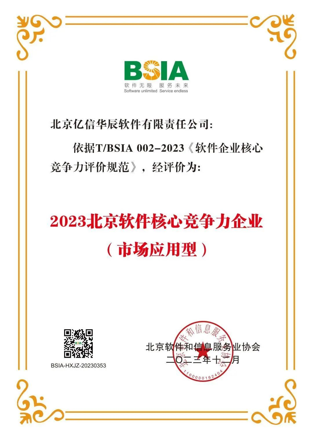 據悉,“2023北京軟件核心競爭力企業”主要依據《軟件企業核心競爭力評價規范》(T/BSIA 002-2023)團體標準,針對產業帶動力、技術創新力、市場影響力、業務前瞻性等核心競爭力,評價出平臺賦能型、技術研發型、市場應用型、業務探索型四大類型企業,再次入選也表明了億信華辰在市場應用中具有強大的行業綜合發展潛力。