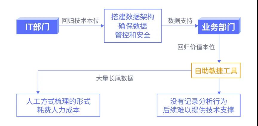 到了21世紀,以有一定IT能力的業務人員為中心的自助式數據分析平臺開始盛行,二代敏捷BI的熱潮襲來,在這段時間里BI廠商也如雨后春筍般涌現,并競相大力發展可自助式分析的BI產品。雖然敏捷BI的出現一定程度上解決了部門協同的問題,但是敏捷BI對于長尾數據難以有效處理,同時分析經驗和知識體系難以進行沉淀,IT部門很難在后續為其提供技術支撐,使其也有一定的局限性。
