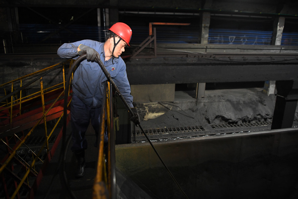 圖3:裝卸工韓偉用風(fēng)管清理車皮內(nèi)部積煤。