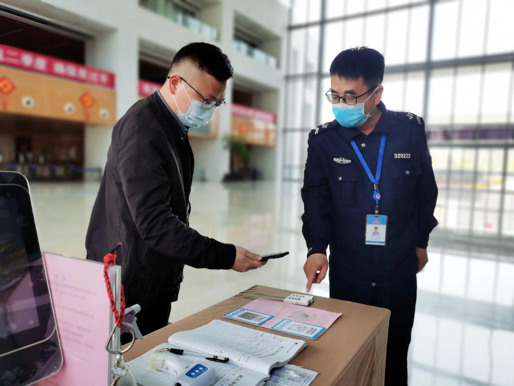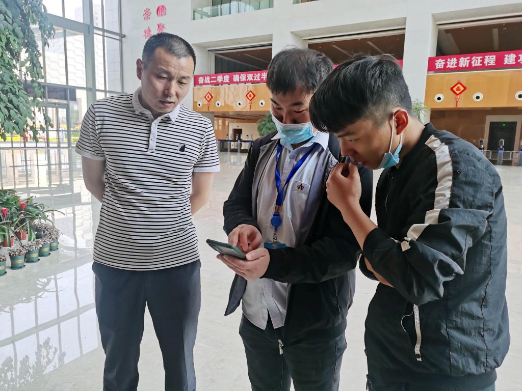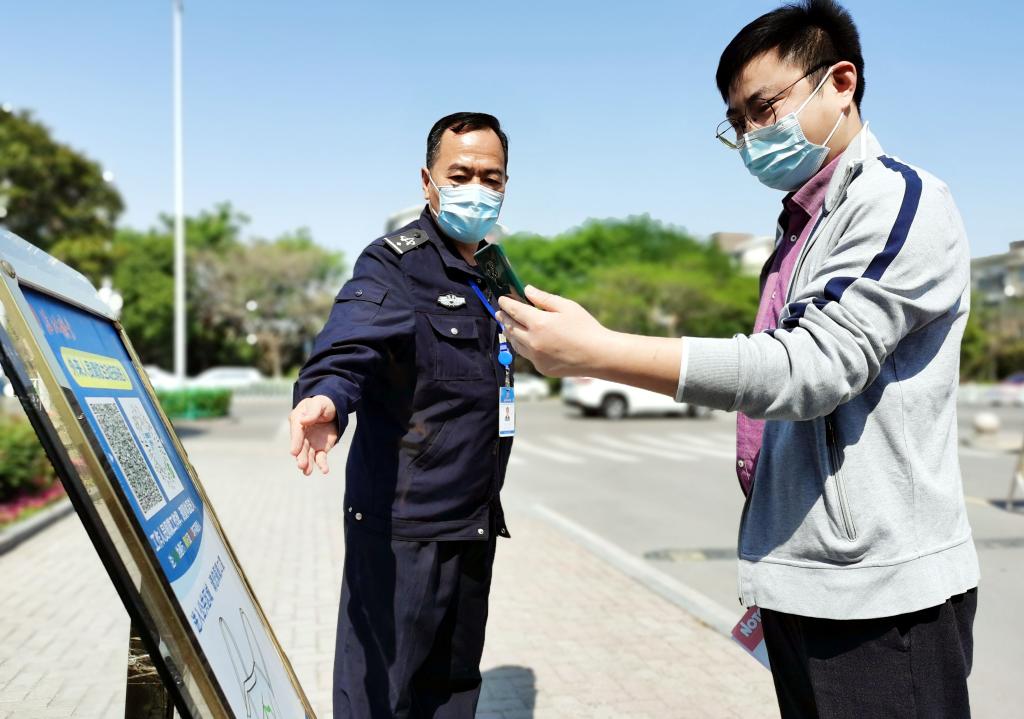 5月2日上午10:10,辦公中心西門崗值班職工孫正國(左一)在對訪客做疫情防控“雙碼”檢查。他表示,“五一”期間也要嚴(yán)格把好“入口關(guān)”,堅(jiān)決保證疫情防控安全。