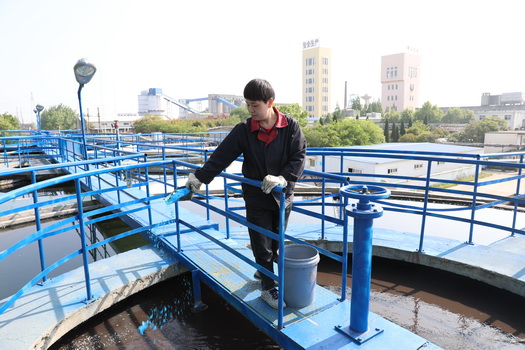 水廠女工董明明在凈化池加藥
