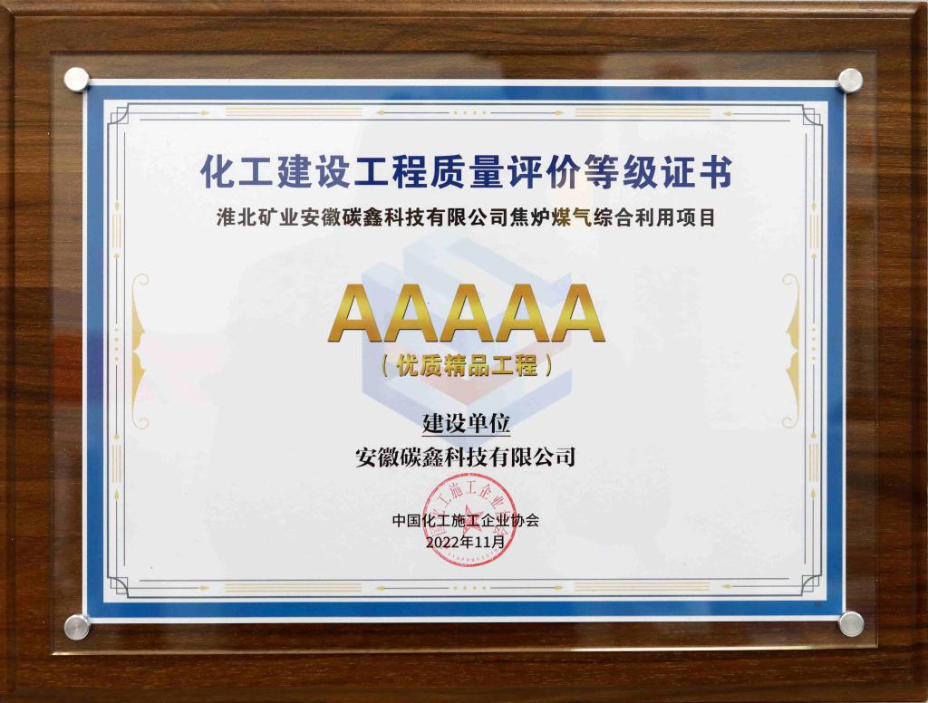 近日,2022年化工建設工程質(zhì)量評價結(jié)果出爐,安徽碳鑫科技有限公司焦爐煤氣綜合利用項目獲評2022年全國化工行業(yè)工程質(zhì)量建設的最高榮譽——5A級優(yōu)質(zhì)精品工程。