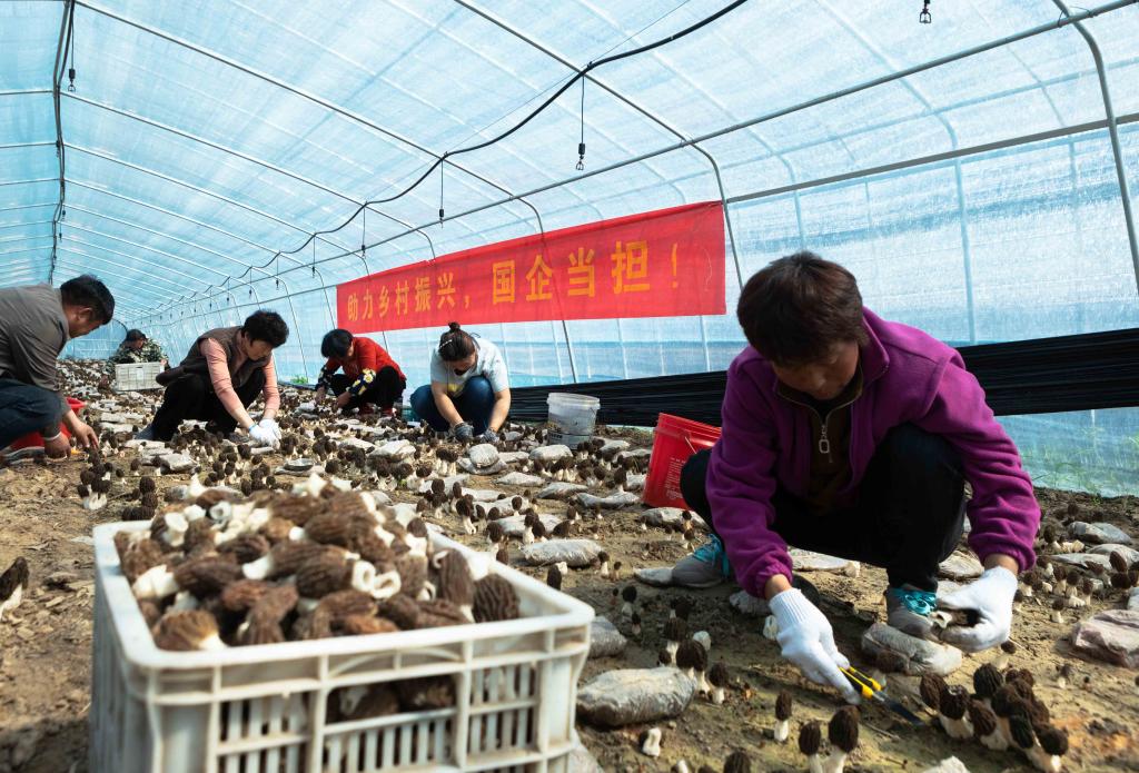 3月29日,在淮北礦業集團援建的碭山縣曹莊鎮53畝羊肚菌種植基地,村民正忙著采摘、搬運成熟的羊肚菌,一派豐收繁忙景象。