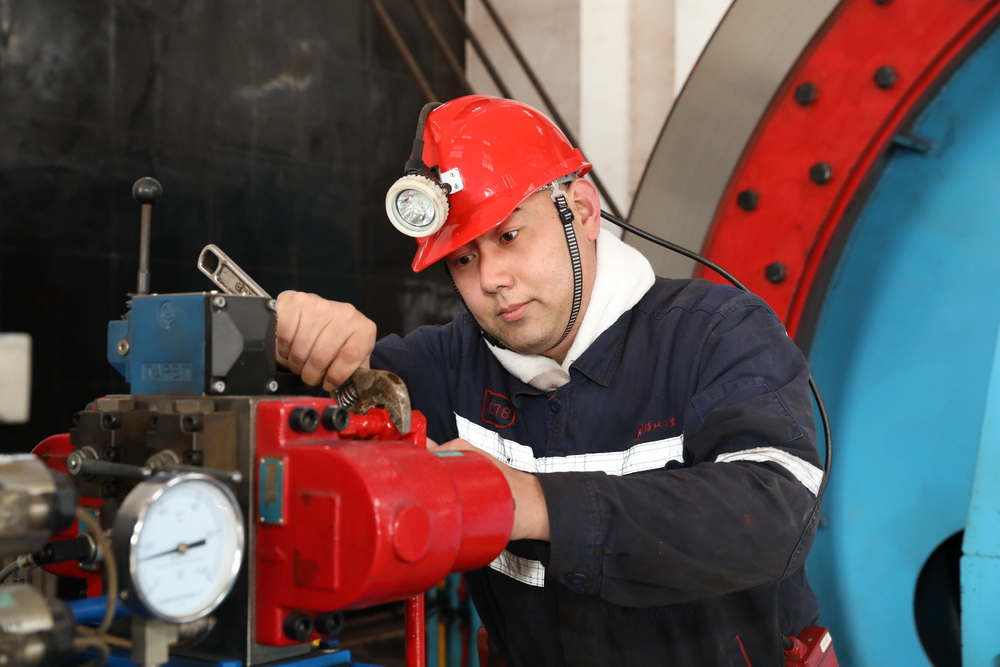 該礦保運區職工宋清杰(左)與工友查驗主提升鋼絲繩。