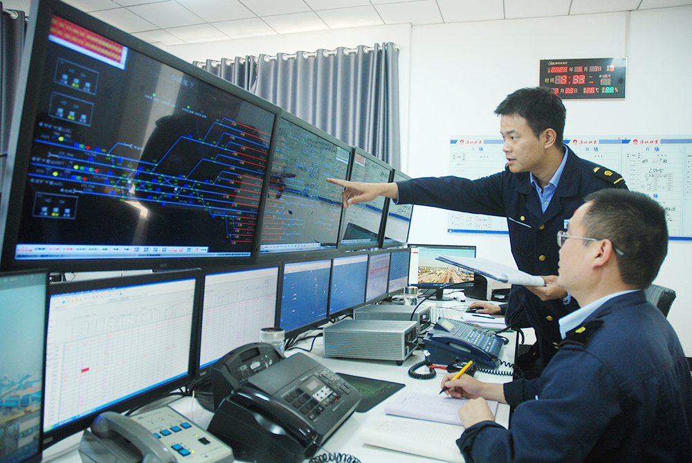 圖為湖集中心站行車室主任王迪現場盯控運輸組織作業