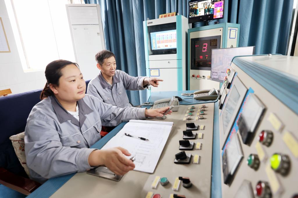 熱電分公司生產技術科科長劉國中在中控室檢查生產數據。