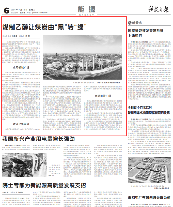 《科技日報》:煤制乙醇讓煤炭由“黑”轉“綠”